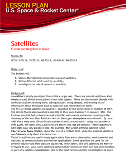 Welcome to the virtual outreach unit on Satellites from The U.S. Space and Rocket Center! We would like to thank the Northrop Grumman Foundation for their generosity in sponsoring the development of this unit. In this unit you will find many resources that will help you provide an exciting and educational experience for your students. From introductory concepts to career connections, in addition to activities and lesson plans, we hope you find everything you need for a successful teaching experience. Please see below for a detailed listing of the unit: